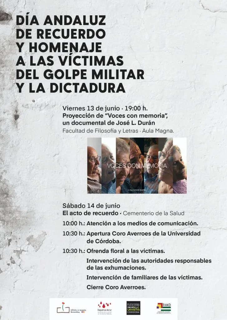 Como en los últimos años, el pasado sábado 14 de junio, las asociaciones memorialistas y la Cátedra de Memoria Democrática de la Universidad de Córdoba convocaron al «Día de recuerdo y homenaje a las víctimas del golpe militar y la Dictadura» instituido por la vigente Ley de Memoria Histórica y Democrática de Andalucía desde 2017.