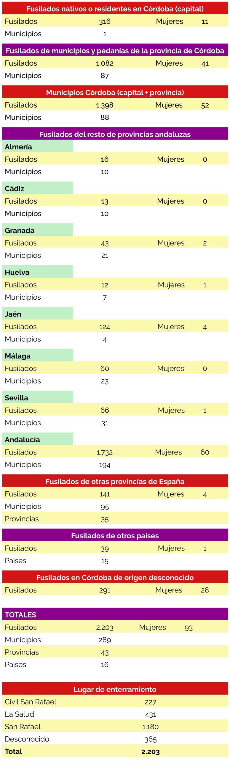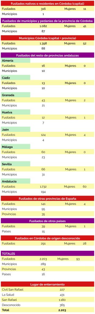 Hace años el movimiento memorialista de Córdoba capital con la colaboración del Archivo Histórico Municipal acometió la tarea de elaborar un censo de víctimas desaparecidas y no reparadas de la Guerra Civil y del franquismo enterradas en los cementerios de Córdoba. El resultado es el documento adjunto donde se recogen datos del fallecimiento (fecha, motivo y lugar de enterramiento), edad, o procedencia de víctimas ordenadas por lugar de origen o residencia de las víctimas. Las nombres incluidos en este listado lo están porque hay constancia documental de su asesinato en algunas de las fuentes que se recogen en la penúltima columna del mismo. La relación de víctimas mortales es sensiblemente más amplia. A las conocidas, hay que sumarle todas aquellas anónimas y desaparecidas para las que carecemos de respaldo documental. En total las estimaciones se proyectan hasta el entorno de los 4000 represaliados enterrados en los cementerios de Córdoba capital.