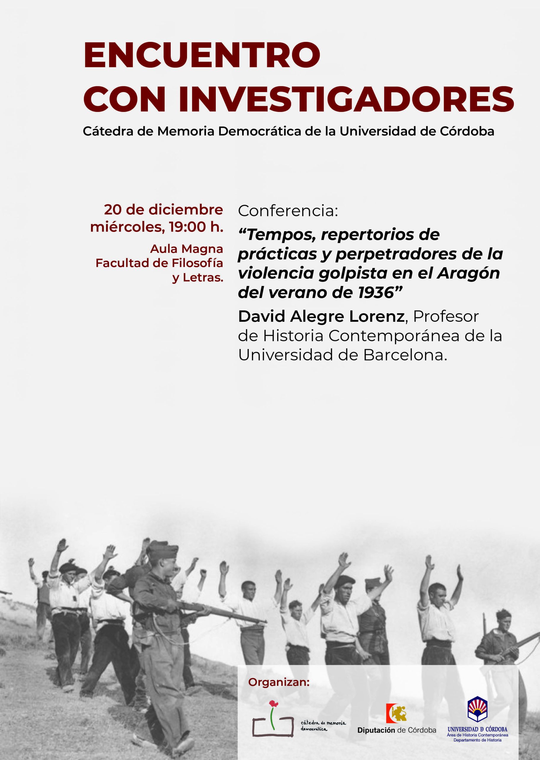 Esta charla se planteó con un perfil de investigación más definido. De hecho, aunque abierta al público como todas, se concibió como un seminario de especialistas. De hecho se ofreció como actividad doctoral. En ella el profesor Alegre Lorenz, uno de los más destacados especialistas en la materia, planteo los desafíos metodológicos y epistemológicos relacionados con la investigación de los perpetradores, una de las líneas recientes de trabajo que empiezan a abordarse por la historiografía sobre la Guerra Civil y el franquismo. A partir de aquí plateará algunos de los desarrollos abordados por el mismo en sus trabajos sobre la materia en Aragón.
